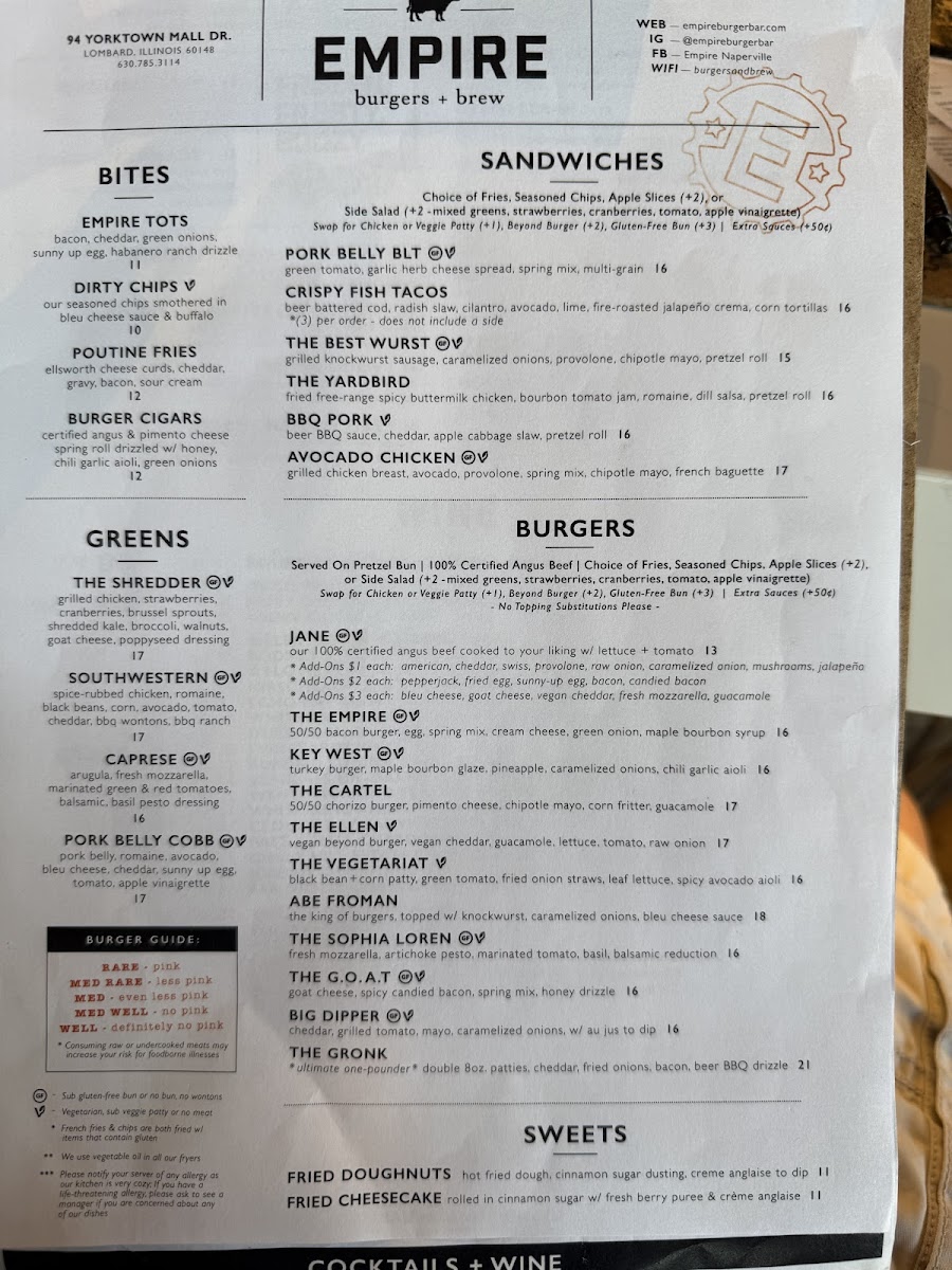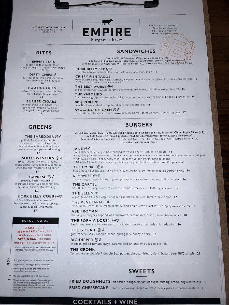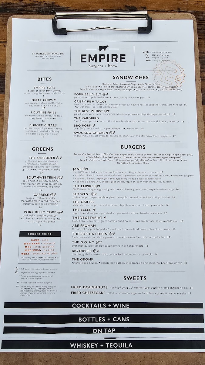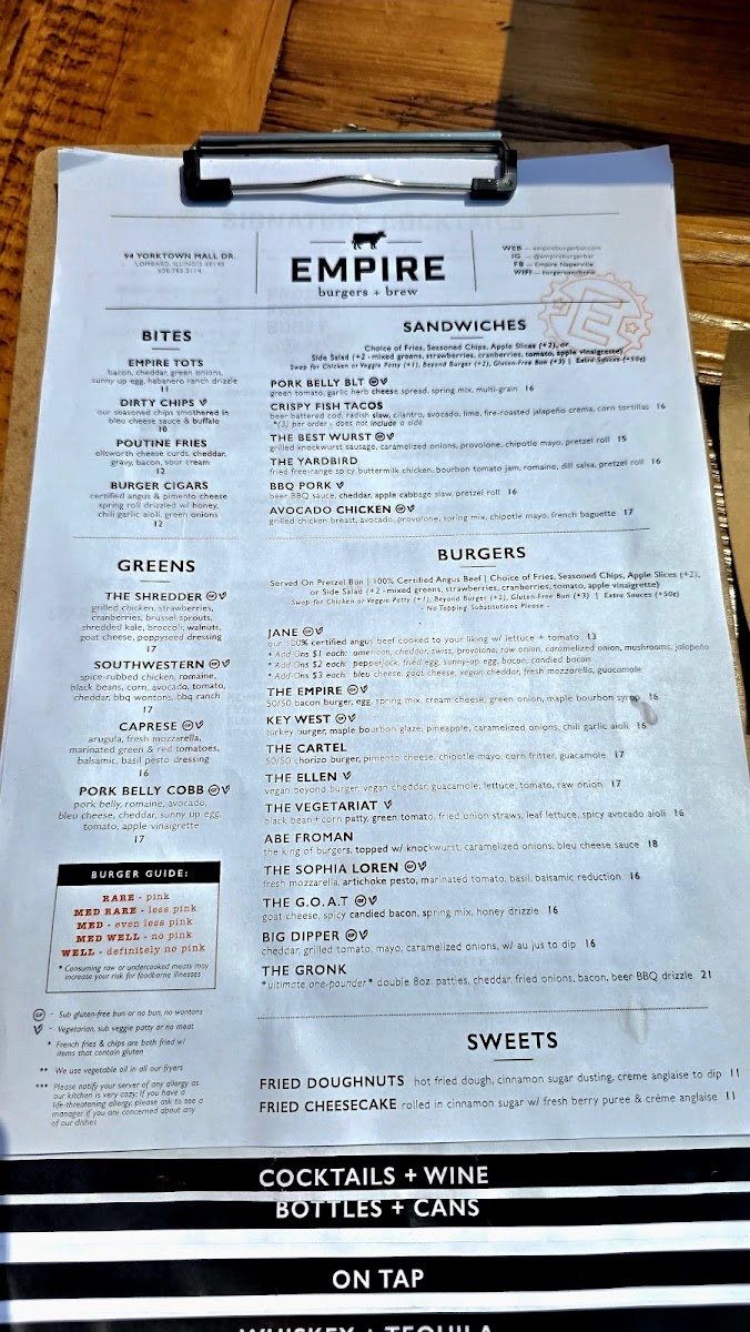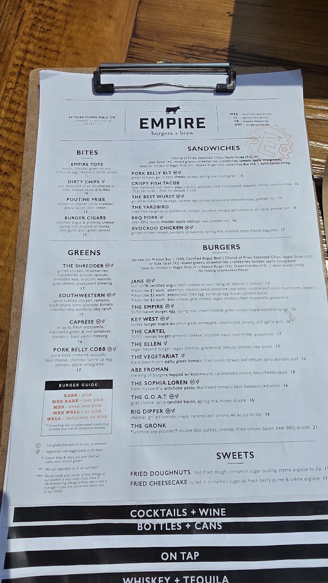 The menu at Empire Burgers + Brew offers a relaxed, approachable selection that fits perfectly with its casual bar and restaurant vibe. Whether you're stopping by for a laid-back lunch, an evening catch-up with friends, or to enjoy a game on TV, the focus is on familiar American classics with thoughtful touches.